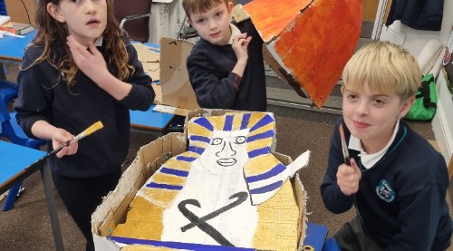 In Nessa Class, our theme has been Ancient Egypt, and the children have been fully immersed in discovering what life was like thousands of years ago along the River Nile. One of the highlights has certainly been our hands-on projects. The class worked brilliantly together to design and build their very own pyramids, exploring how these iconic structures were engineered and why they were so important in Egyptian culture. Even more impressively, the children created a large cardboard sarcophagus, complete with intricate designs and symbols inspired by the artefacts found inside real ancient tombs.
