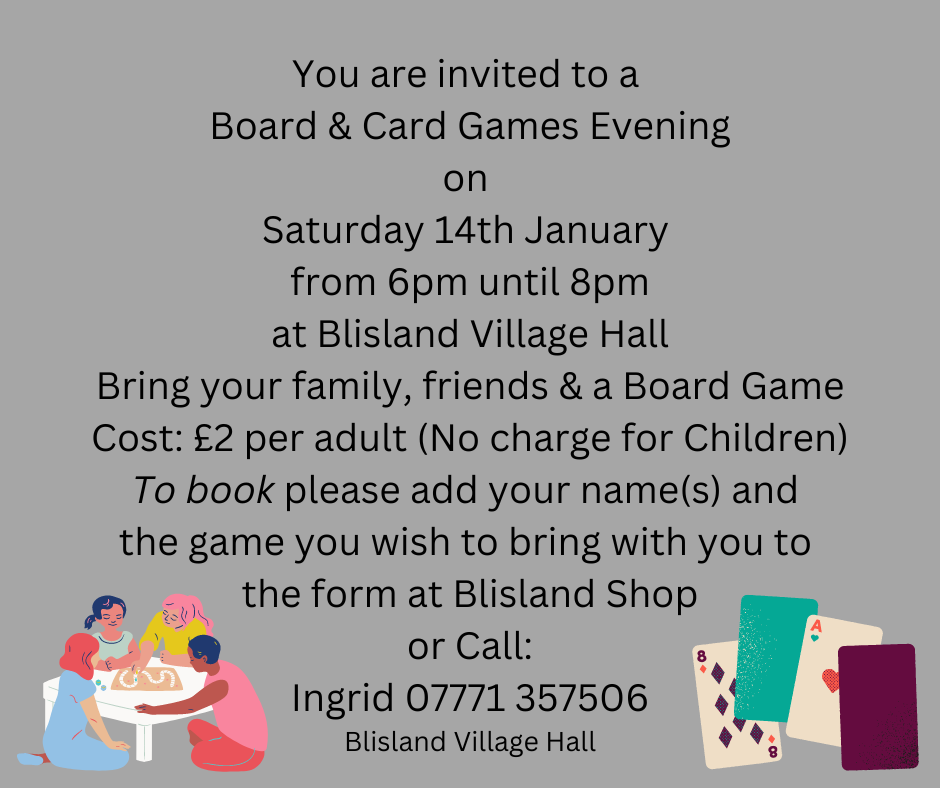 Next Saturday (14th January) the Village hall are hosting a family games night. More information is attached in the poster below.